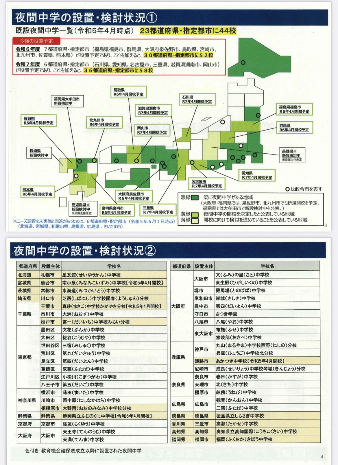 文部科学省の調査によれば、2023年4月現在すでに夜間中学校がある自治体は、17都道府県、夜間中学校の開校を決定したと公表している自治体が11県、開校にむけた検討を進めていると公表した自治体は3県となっています(資料1をご覧ください)。