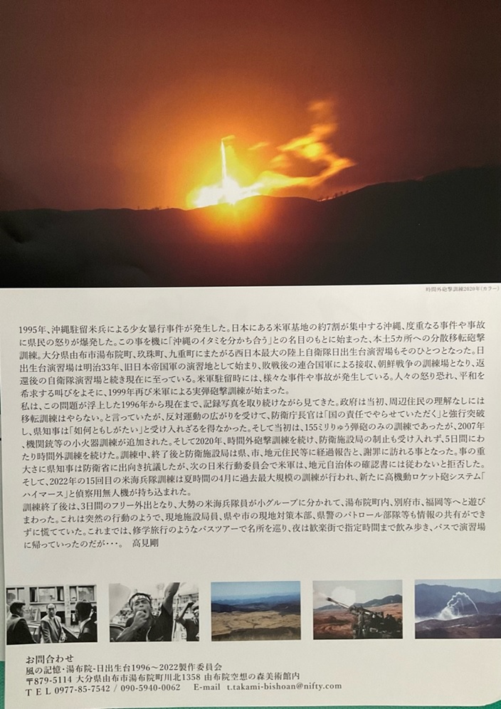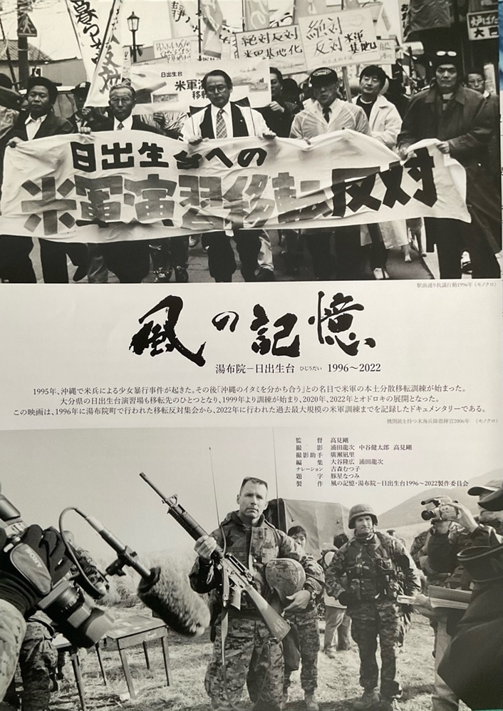 その日出生台での在沖縄米軍海兵隊の訓練や訓練後の様子を、見事に1時間の記録映画に収めた「風の記憶 湯布院―日出生台1996〜2022」(高見剛監督)が完成し、それを見る機会に恵まれました。